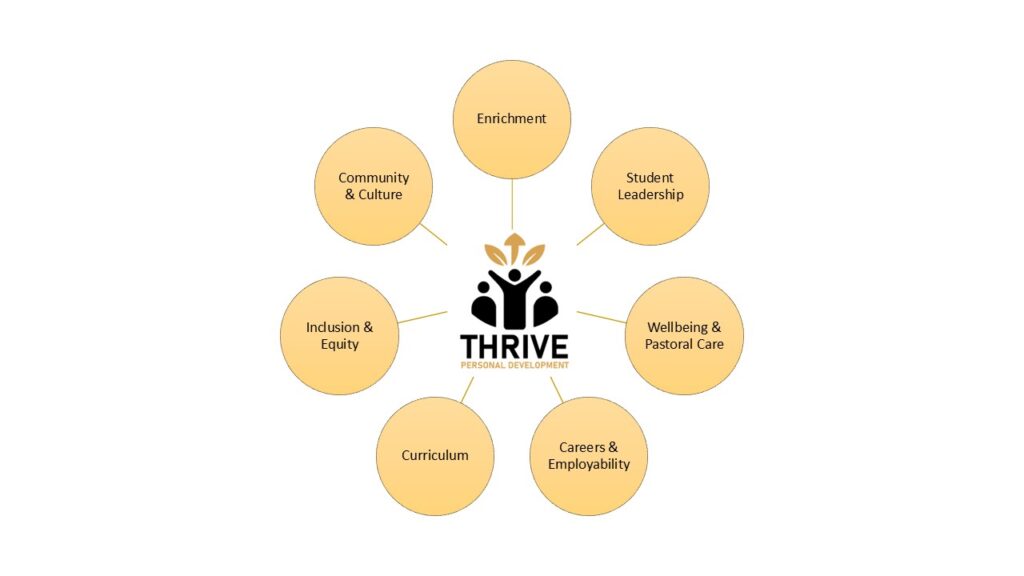 We recognise that education is about far more than exam results. The Thrive Curriculum brings together key areas of school life that Ofsted identifies as essential to outstanding personal development: enrichment, student leadership, wellbeing and pastoral care, careers and employability, curriculum for life, inclusion and equity, and community and culture.